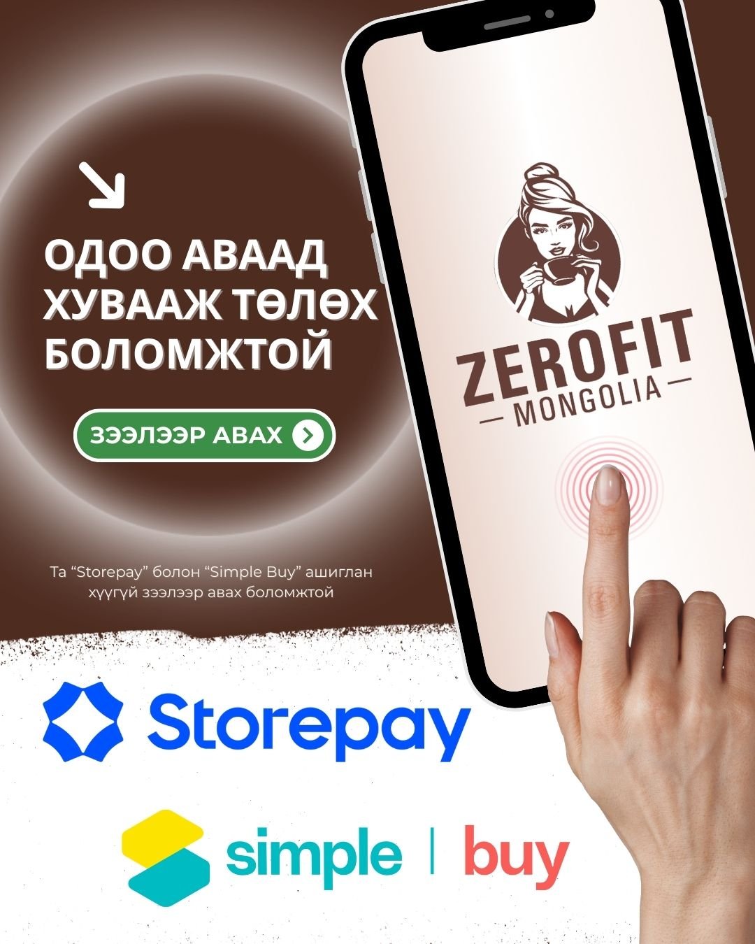 Та “Зерофит” брэндийн бүх бүтээгдэхүүнийг хамгийн уян хатан Storepay, SimpleBuy апп ашиглан авах боломжтой.