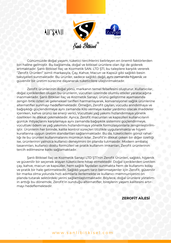 Şanlı Bitkisel компани нь Туркийн зах зээлд олон жилийн туршлагатай, тогтвортой хөгжлийн бодлого баримталж, эрүүл мэндийн салбарт шинэлэг бүтээгдэхүүн үйлдвэрлэдэг. Байгалийн ургамлыг сонгохоос эхлээд, эцсийн бүтээгдэхүүн хүртэл чанарын хатуу хяналтад ордог.